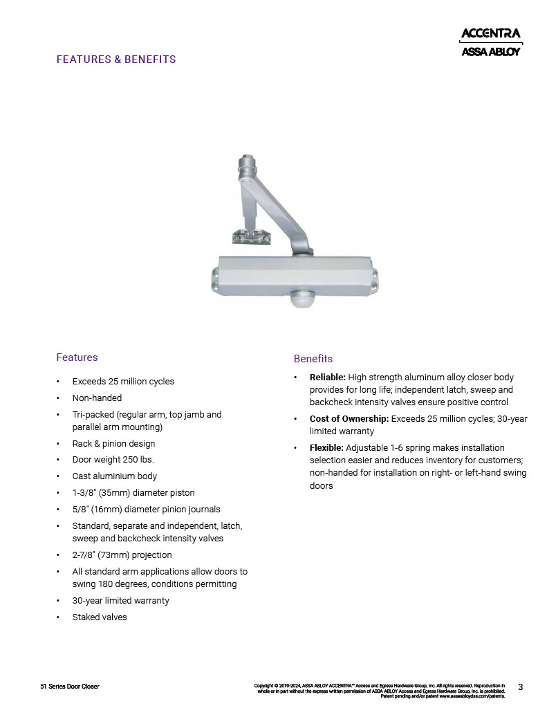 Series 51 Multi-Sized Door Closer Fully adjustable through the power range of sizes 1 through 6, as outlined in ANSI/BHMA specification A156.4. Also, complies with the opening force requirements as outlined in the Americans with Disabilities Act (A.D.A.) and ANSI A117.1 for interior doors.