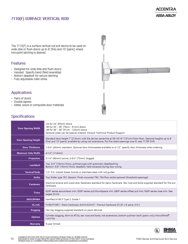 - Accentra (Yale) 7110F Fire Rated surface vertical rod Exit Device -48"