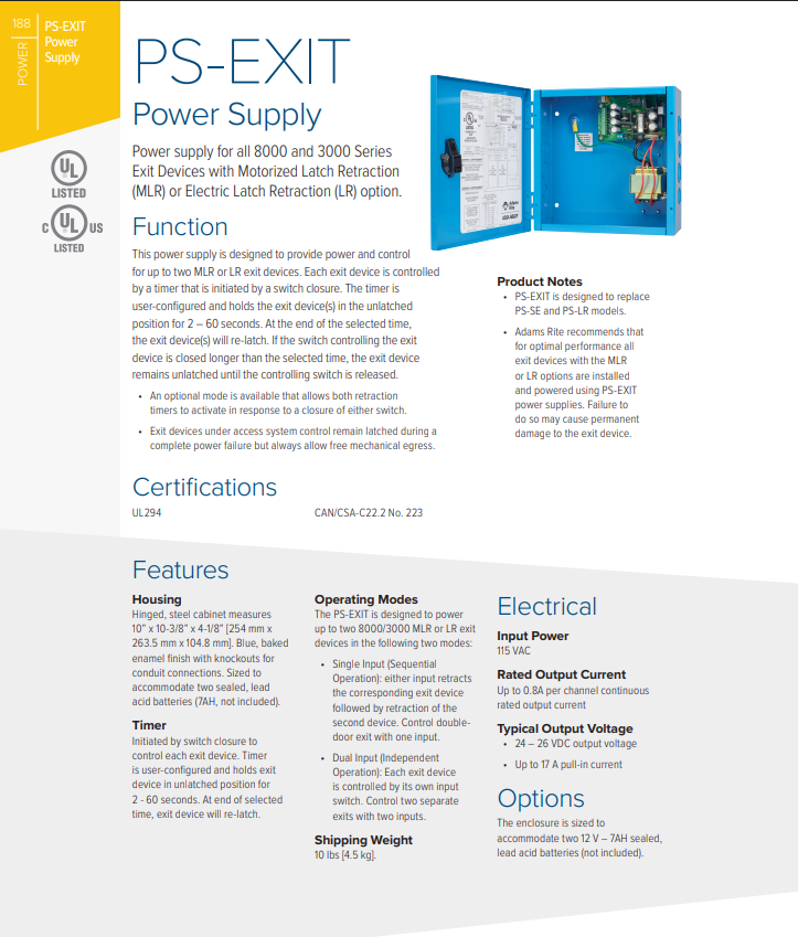 • Adams Rite recommends that for optimal performance all exit devices with the MLR or LR options are installed and powered using PS-EXIT power supplies. Failure to do so may cause permanent damage to the exit device.