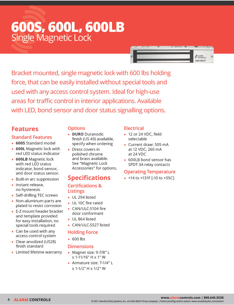 - Alarm Controls 600SDURO Magnetic Lock - For Single Door - 600 lbs Holding, Force Dark Bronze
