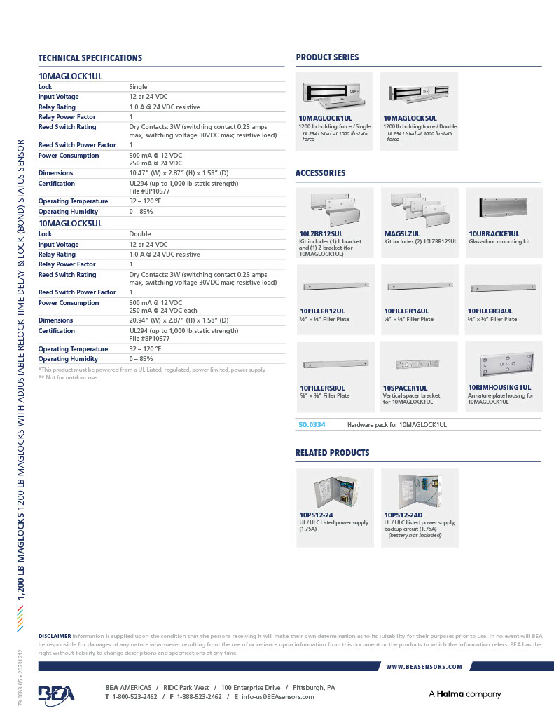 BEA 10MAGLOCK1UL Single Electromagnetic Surface Mount Lock, UL / ULC Listed, LED Status, Lock Status Sensor (NO or NC Outputs), 0 to 90 S Hold Open Timer (Relock), (1) Bond Status Relay, 12 / 24 VDC (UL Listed Power Supply Required), 1200 Lb.