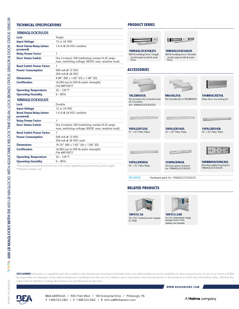 BEA 10MAGLOCK3ULDS Single Electromagnetic Surface Mount Lock, UL / ULC Listed, LED Status, Lock Status Sensor / Door Status Sensor, 0 to 90 S Hold Open Timer (Relock), 12 / 24 VDC (UL Listed Power Supply Required), 600 Lb.
