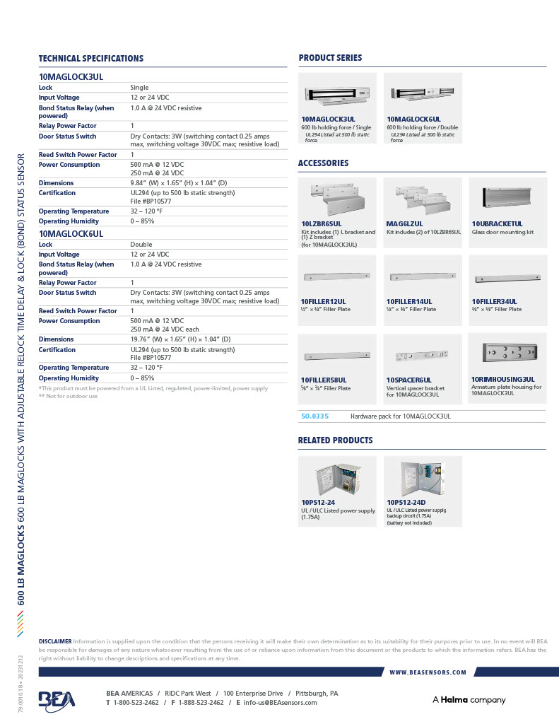 BEA 10MAGLOCK6UL Double Electromagnetic Surface Mount Lock, UL / ULC Listed, LED Status, Lock Status Sensor (NO or NC Outputs), 0 to 90 S Hold Open Timer (Relock), (1) Bond Status Relay, 12 / 24 VDC (UL Listed Power Supply Required), 600 Lb.