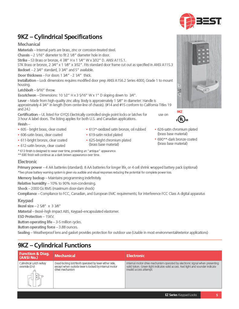 BEST 9KZ37DV Standalone Electronic Keypad Lever Lock