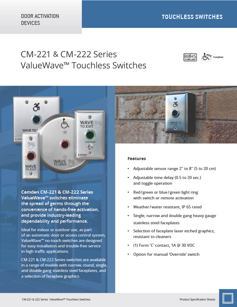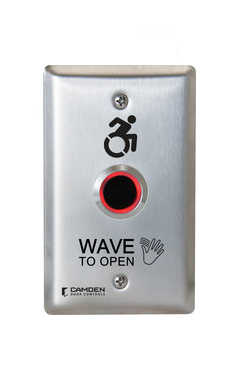 Camden ValueWave(tm) 12/24 VDC touchless switches with 1 relay are IP 65 rated for indoor/outdoor use, ideal for use in automatic door/access control systems.