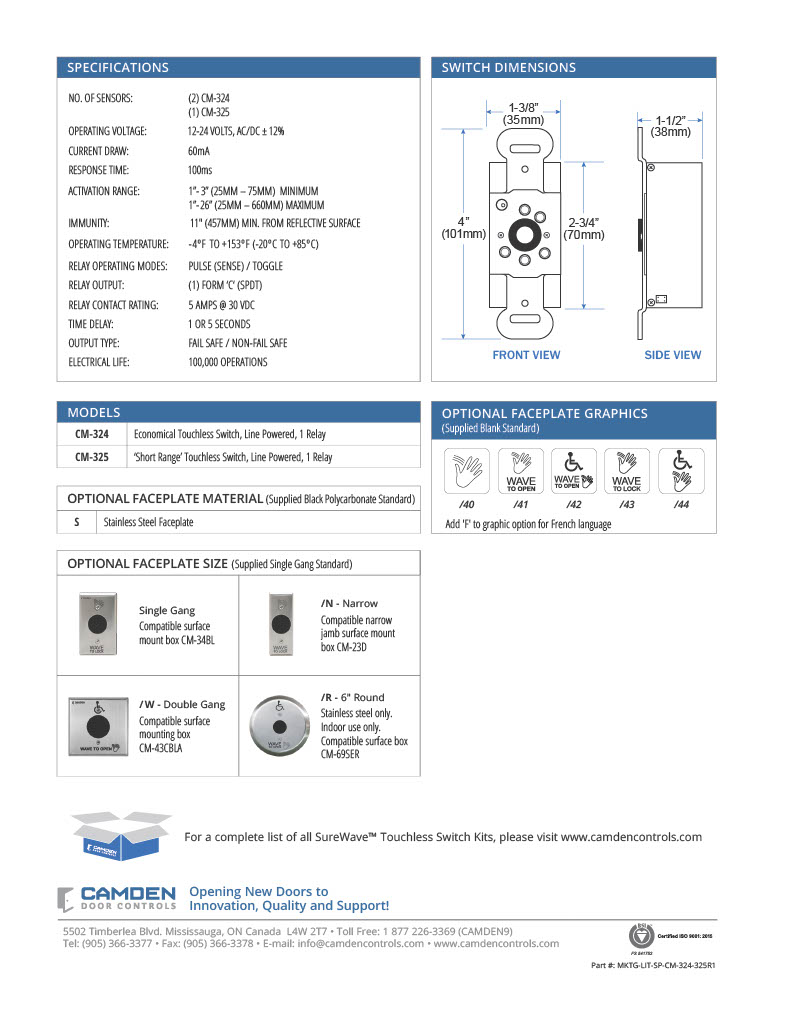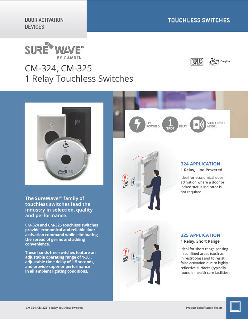 CM-324 Series (original) single relay wired hands-free switches features an operating range of 1-30", adjustable time delay of 1-5 seconds, and provides superior performance in all ambient lighting conditions.