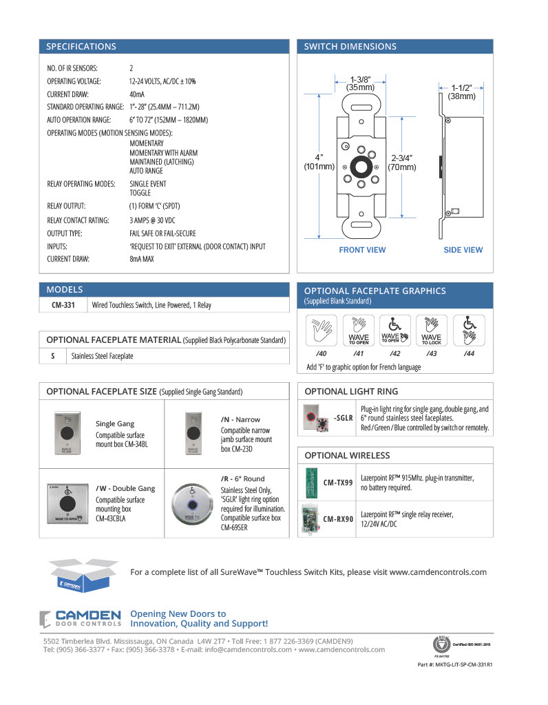 CM-330 offers an adjustable operating range, selectable motion sensing and relay operating modes, hold open timer(s), REX and door position inputs, and the option for a light ring and wireless transmitter.