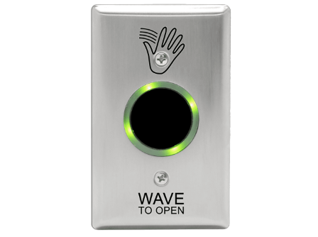 Camden CM-331/41S-SGLR SureWave Touchless Switch, 1" to 28" Range, 1 Relay, Single Gang Stainless Steel Hand Icon/'Wave to Open' Text Faceplate, Includes 1 Tri-Color Light Ring, Stainless Steel Finish