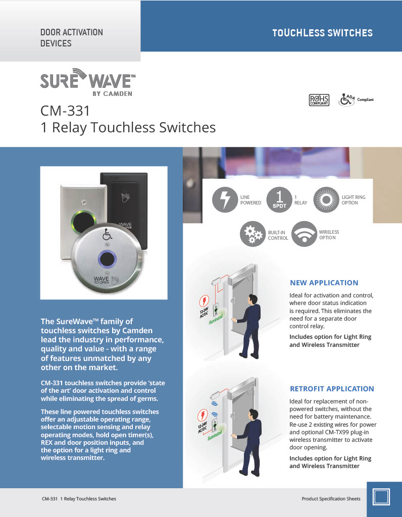 CM-330 offers an adjustable operating range, selectable motion sensing and relay operating modes, hold open timer(s), REX and door position inputs, and the option for a light ring and wireless transmitter.