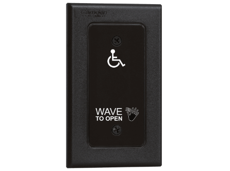 Camden CM-333/42N SureWave Touchless Switch, 1" to 12" Range, 1 Relay, Single Narrow Hand Icon/'Wave to Open' Text/Wheelchair Symbol Faceplate, Includes 2 'AA' Alkaline Batteries, Black Finish