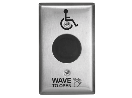 Camden CM-333/42S SureWave Touchless Switch, 1" to 12" Range, 1 Relay, Single Gang Stainless Steel Hand Icon/'Wave to Open' Text/Wheelchair Symbol Faceplate, Includes 2 'AA' Alkaline Batteries, Stainless Steel Finish