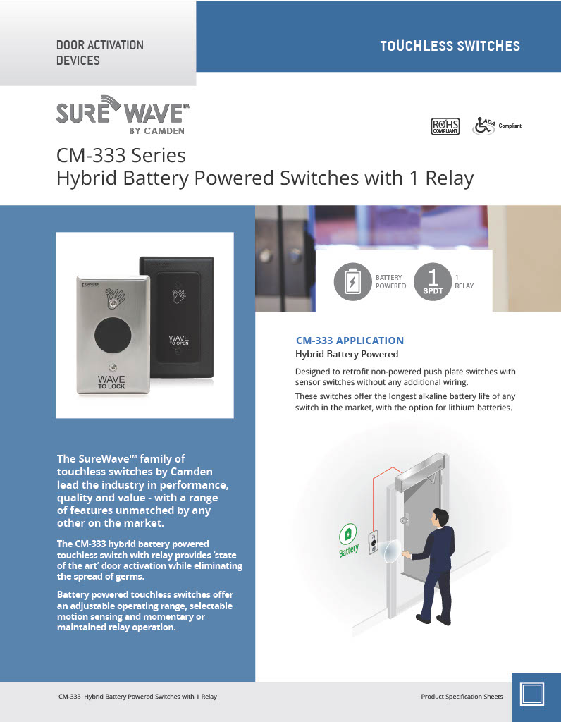 CM-333 hybrid battery powered touchless switch with relay provides "state of the art" door activation while eliminating the spread of germs.