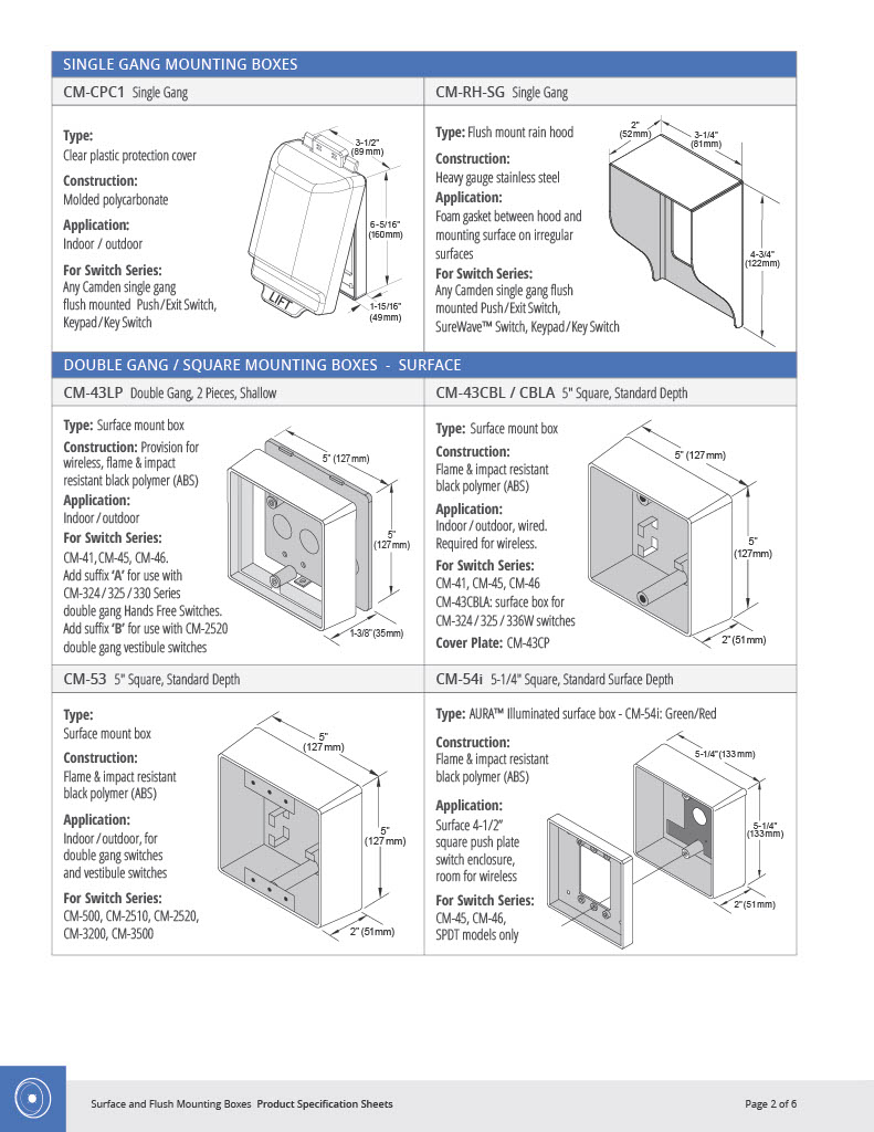 Camden offers the industry's most extensive range of ABS plastic and metal boxes, enclosures and trim rings for flush, semi-flush and surface mounting. ABS plastic models are flame and vandal resistant and are ideal for use with wireless door control transmitters.