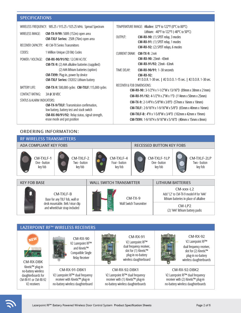 Camden Door Controls guarantees the Lazerpoint RF (TX-9, RX-91,or RX-92 models) to be free from manufacturing defects for 3 years from date of sale.If during the first 3 years a Lazerpoint RF component fails to perform correctly, it may be returned to our factory where it will be repaired or replaced (at our discretion) without charge. Except as stated herein, Camden extends no warranties expressed or implied regarding function, performance or service.