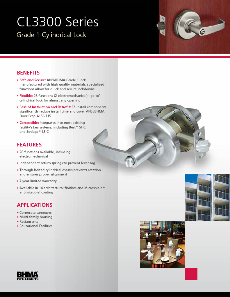 Keying Features Available:Master keying, Construction master keying, Interchangeable core (IC).