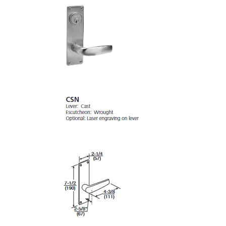*Strike:*Wrought brass, bronze or stainless steel, ANSI straight lip standard, 4-7/8" (124mm) x 1-1/4" (32mm) x 1-1/8" (29mm) lip to center. Optional strikes, lip lengths and ANSI wrought strike box available