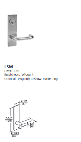 *Strike:*Wrought brass, bronze or stainless steel, ANSI straight lip standard, 4-7/8" (124mm) x 1-1/4" (32mm) x 1-1/8" (29mm) lip to center. Optional strikes, lip lengths and ANSI wrought strike box available