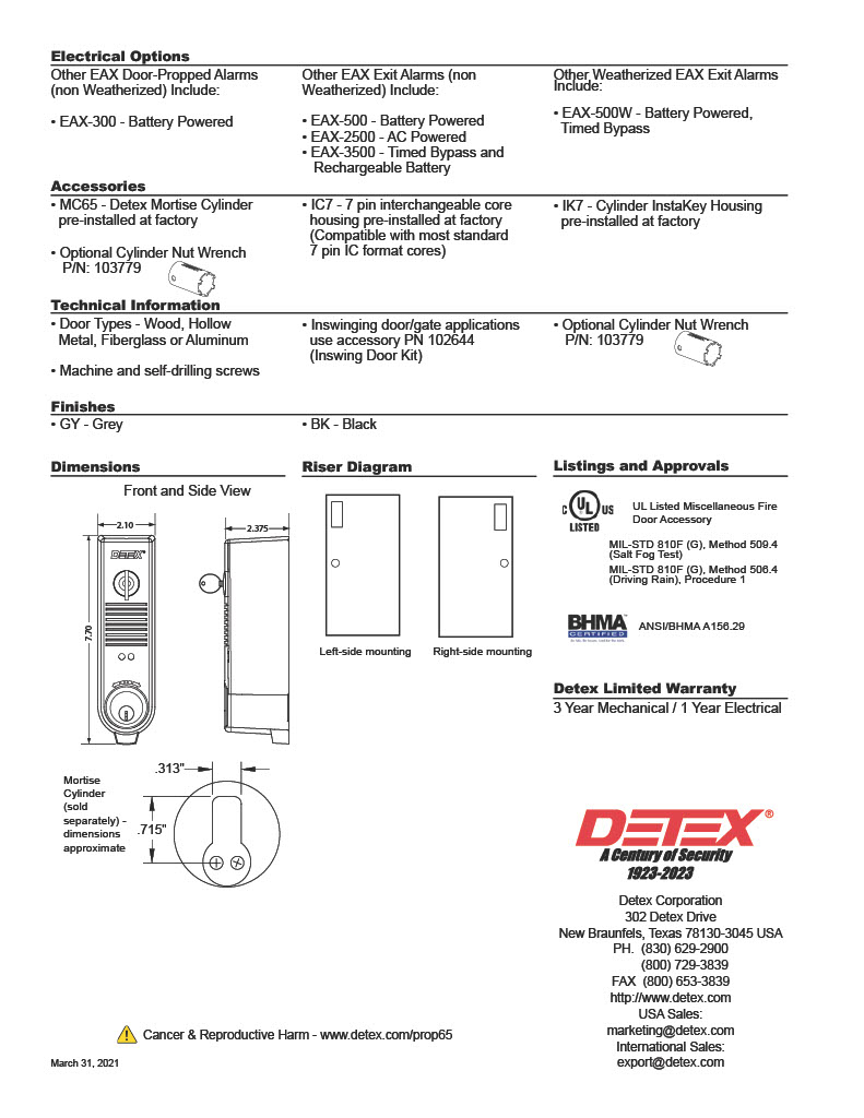 Detex EAX-2500F AC/DC External Powered Wall Mount Exit Alarm - Flush Mount