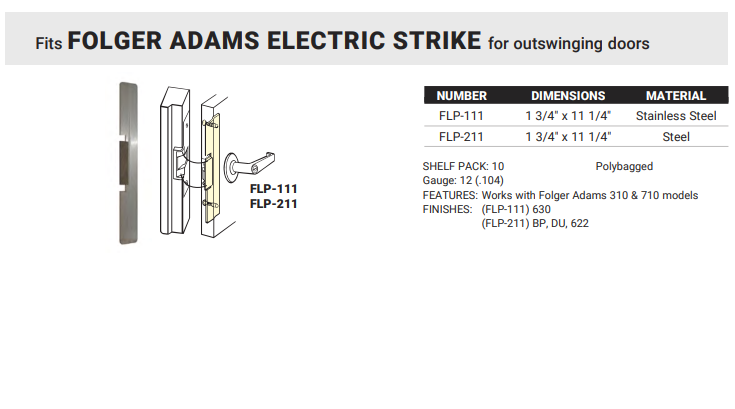 - Don-Jo FLP-111-630 Fits Folger Adams Electric Strike For Outswinging Doors - 1-3/4" x 11-1/4"