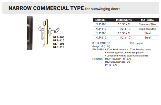 - Don-Jo NLP-110-630 Narrow Commercial Type For Outswinging Doors - 1-1/2" x 10"
