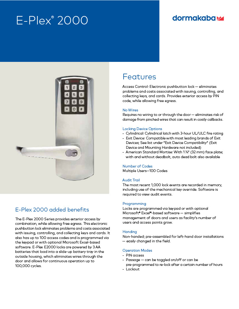 - DormaKaba E2066XSLL-U13-41 E-Plex 2000 Mortise Lock, 100 Access Codes, 1,000 Audit Events, No Deadbolt, KIL, Schlage C Keyway, Dark Bronze