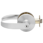 Latch bolt by levers. Outside lever locked by push button in inside lever. Rotating inside lever or closing door releases push button. Emergency release in outside lever unlocks door.