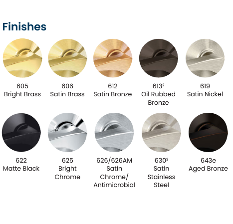 Finishes:Bright brass 605, Satin brass 606, Satin bronze 612, Oil rubbed bronze 613, Bright chrome 625, Satin chrome 626