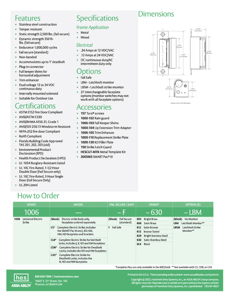 Features:The 1006 series is the strongest and most versatile electric strike available.