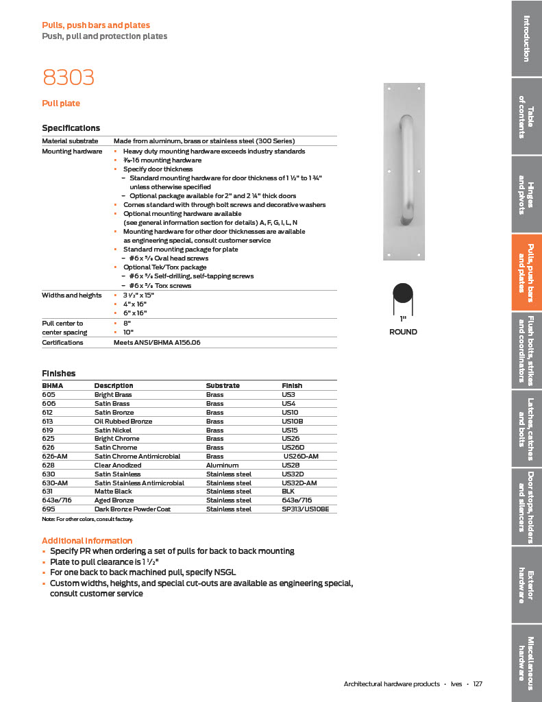 - Ives 8303-8, 8" Door Pull - 1" Round - 3-1/2" x 15" Plate