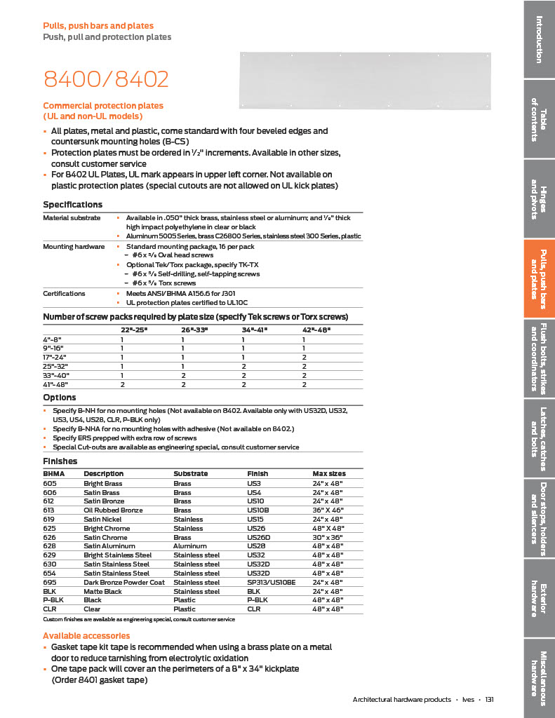 Door protection plates are available in .050thick (US 18 Gauge) brass, stainless steel or aluminum; and 1/8thick high impact polyethylene in clear or black.