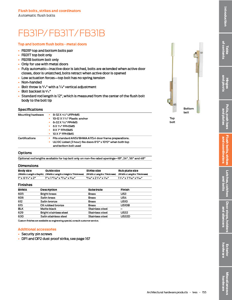 Ives FB31TAutomatic Flush Bolt, Metal Doors,Top Bolt Only