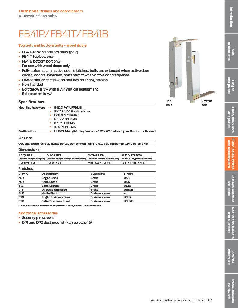 Ives FB41PAutomatic Flush Bolts, Wood Doors, Top & Bottom Bolts(Pair)