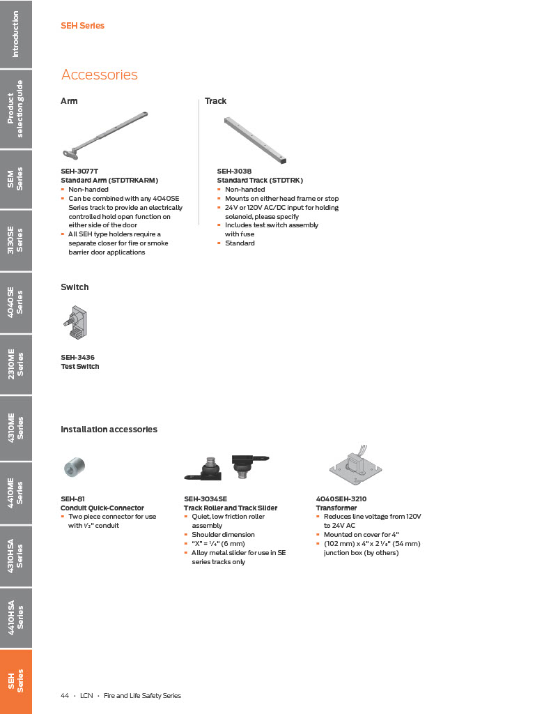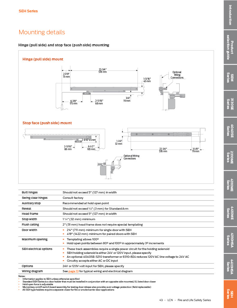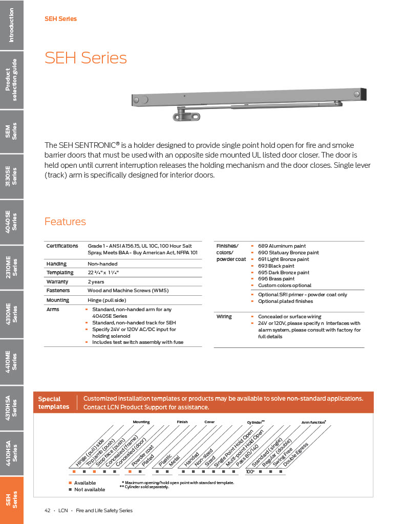 Standard SEH Series is a door holder that must be installed in conjunction with an opposite side mounted, UL listed door closer Hold-open force is adjustable Momentary on/off switch board assembly for testing door release also provides over-voltage protection. Field replaceable All SEH type holders require a separate closer for fire or smoke barrier door applications