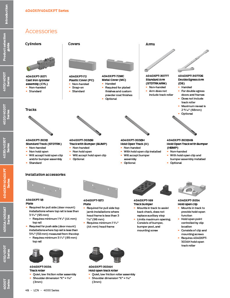 LCN 4040XP:44% increased bearing load capacity - Strongest pinion ever- at 3/4" journal diameter - Widest bearing ever- at 5/8"- Stronger pinion teeth - New V-shieldseal with 20% longer life - XP = eXtra Protection in real world applications - Cast Iron - Forged Steel Arm - Double Heat Treated Steel Pinion - All Weather Fluid - LCN FastPower Adjust - Fast & Accurate Installation.