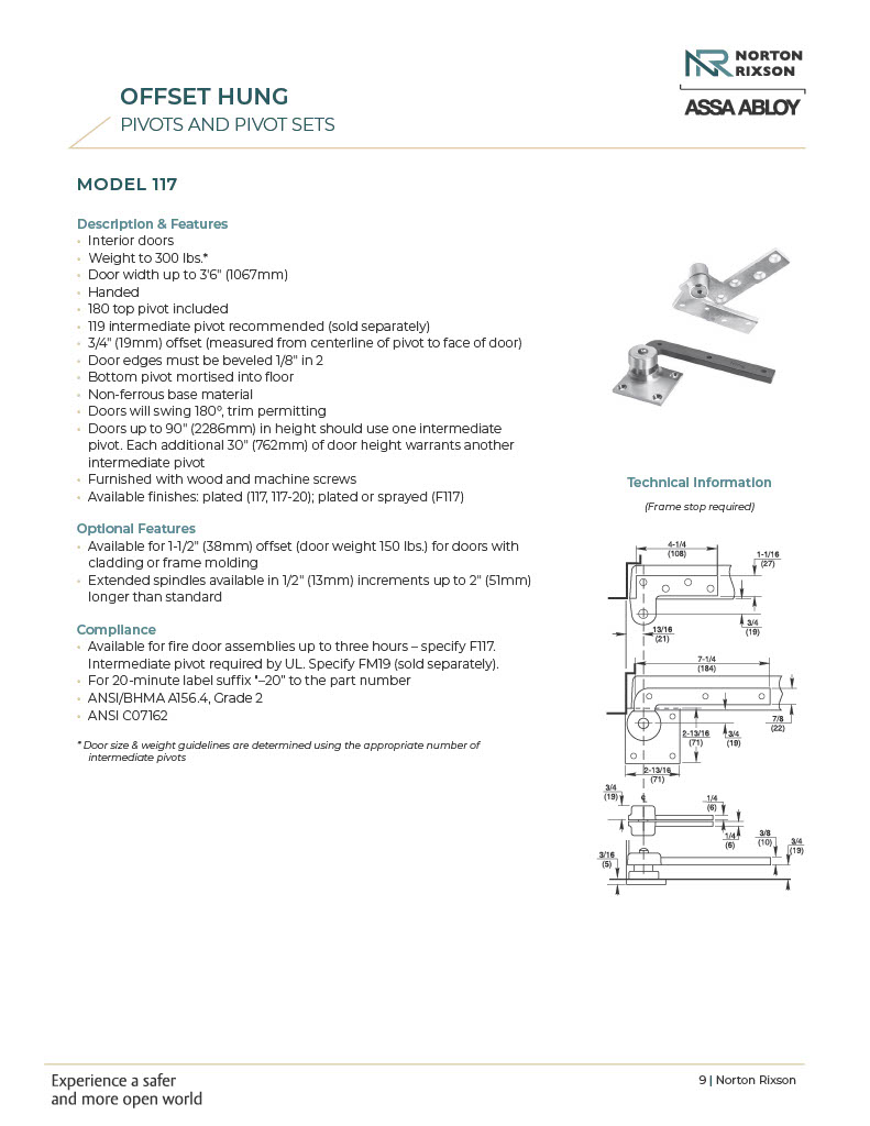 Standard top pivot 180 included119 intermediate pivot recommended (order separately)botttom pivot mortised into floorNon-ferrous base materialDoors up to 90" (2286mm) in height should use one intermediate pivot. Each additional 30" (762mm) of door height warrants another intermediate pivot3/4" (19mm) offset (measured from centerline of pivot to face of door)Door edges must be beveled 1/8" in 2"Furnished with wood and machine screwsExtended spindles available in 1/2" (13mm increments up to 2" (51mm) longer than standardDoors will swing 180 Degree, trim permitting