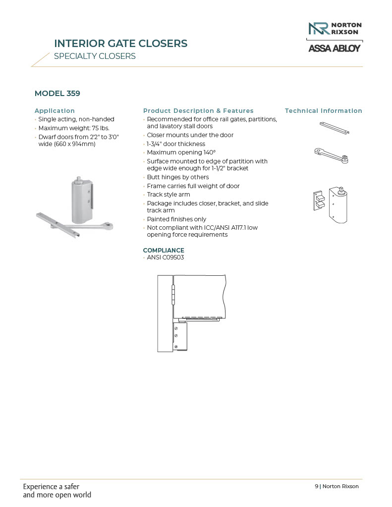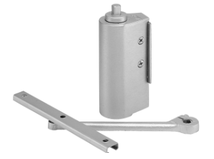 Recommended for office rail gates, partitions, and lavatory stall doorsCloser mounts under the door1-3/4" door thicknessMaximum opening 140 DegreeSurface mounted to edge of partition with edge wide enough for 1-1/2" bracketButt hinges by othersFrame carries full weight of doorTrack style armPackage includes closer, bracket, and slide track armPainted finishes onlyNot compliant with ICC/ANSI A117.1 low opening force requirements