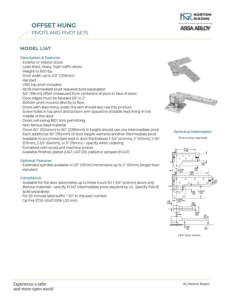 Standard top pivot L180 includedML19 intermediate pivot required (order separately)Bottom pivot mounts directly to floorDoors with lead lining under the skin should also use this product.Screw holes in top pivot and bottom arm spaced to straddle lead lining in the middle of the doorNon-ferrous base materialDoors 60" (1524mm) to 90" (2286mm) in height should use one intermediate pivot. Each additional 30" (762mm) of door height warrants another intermediate pivot3/4" (19mm) offset (measured from centerline of pivot to face of door)Door edges must be beveled 1/8" in 2"Furnished with wood and machine screwsExtended spindles available in 1/2" (13mm) increments up to 2" (51mm) longer than standardDoors will swing 180 Degree, trim permitting
