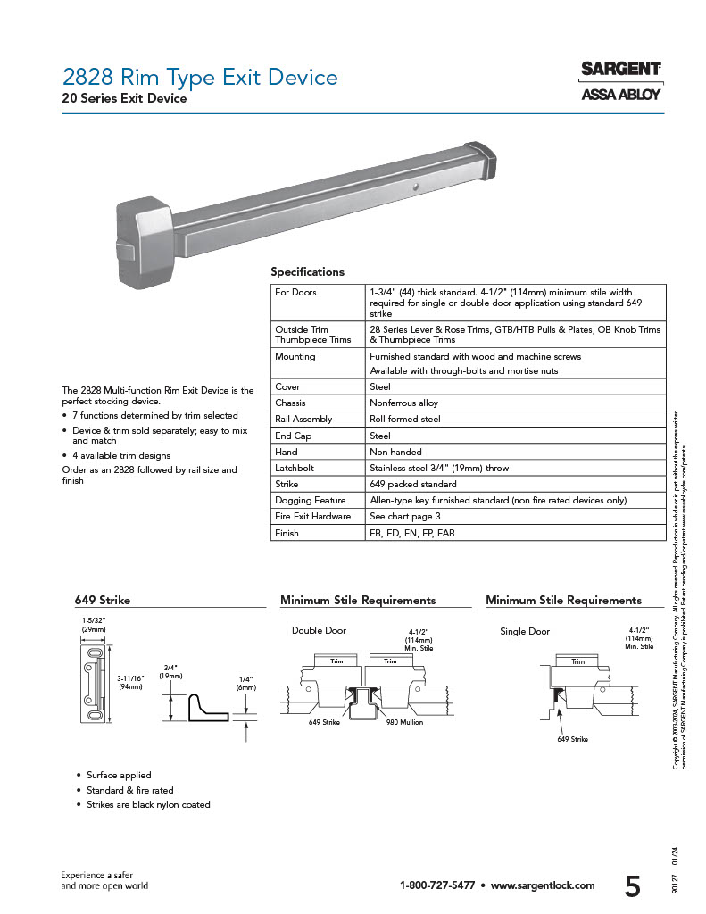 - Sargent 12-2828-G-EN Fire Rated Rim Exit Device - 48", Aluminum