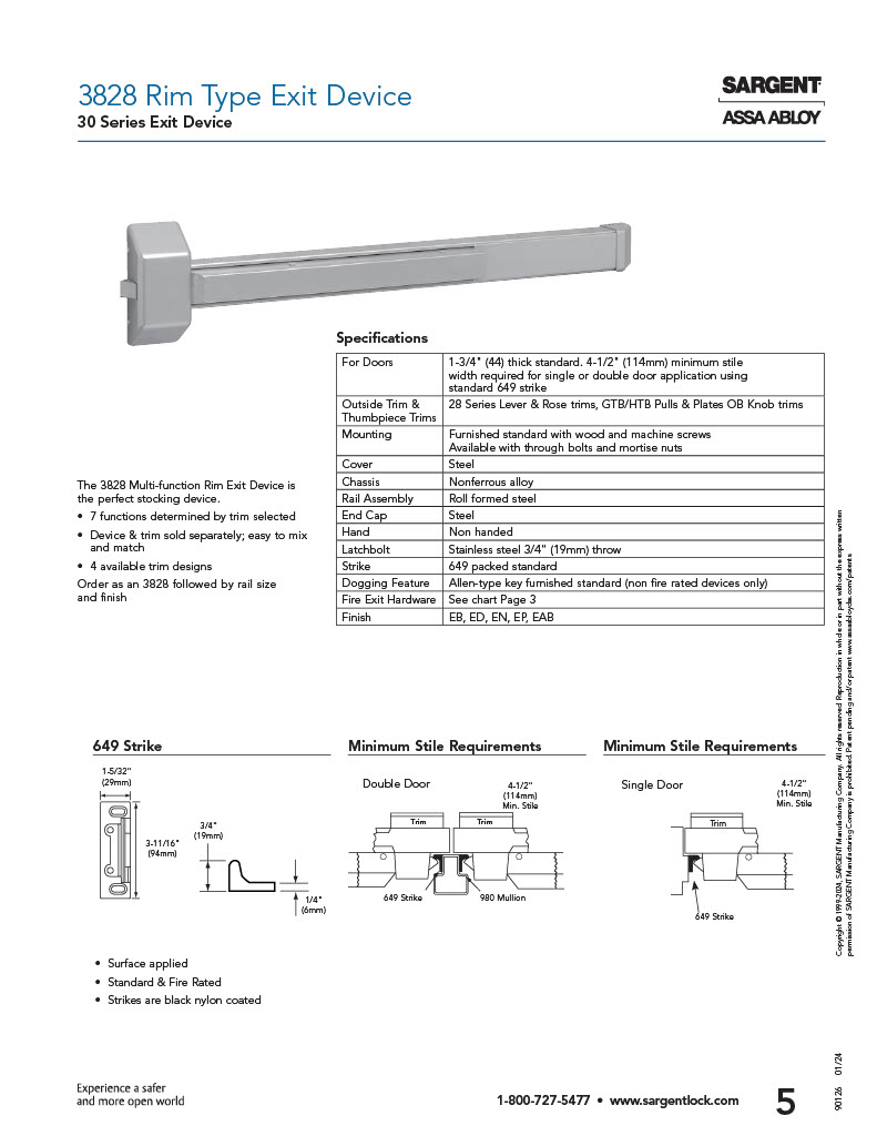 - Sargent 12-3828-G-EN Fire Rated Rim Exit Device - 48" - Aluminum