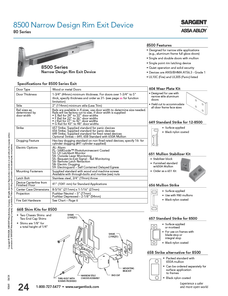 Designed for narrow stile applications Single and double doors with mullion Single point rim latching device Quiet operation and solid security Devices are ANSI A156.3 - Grade 1 UL Fire and Panic listedDoor Types:Wood or metal 1-3/4" (44mm) minimum thickness.