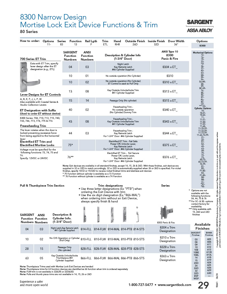 Sargent 8315F-32D Narrow Design Mortise Lock Exit Device*- 36",* Passage Only - Less Trim