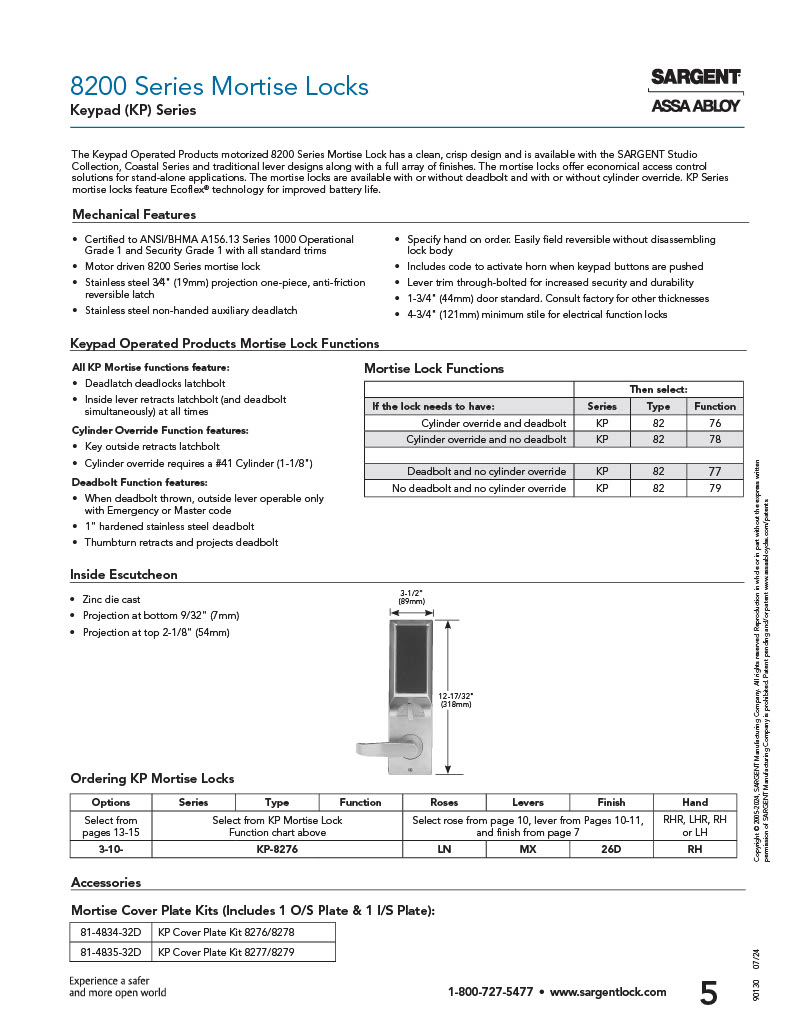 Certified to ANSI/BHMA A156.13 Series 1000 Operational Grade 1 and Security Grade 1 with all standard trims Motor driven 8200 Series mortise lock Stainless steel 3⁄4" (19mm) projection one-piece, anti-friction reversible latch Stainless steel non-handed auxiliary deadlatch Specify hand on order. Easily field reversible without disassembling lock body Includes code to activate horn when keypad buttons are pushed Lever trim through-bolted for increased security and durability 1-3/4" (44mm) door standard. Consult factory for other thicknesses 4-3/4" (121mm) minimum stile for electrical function locks