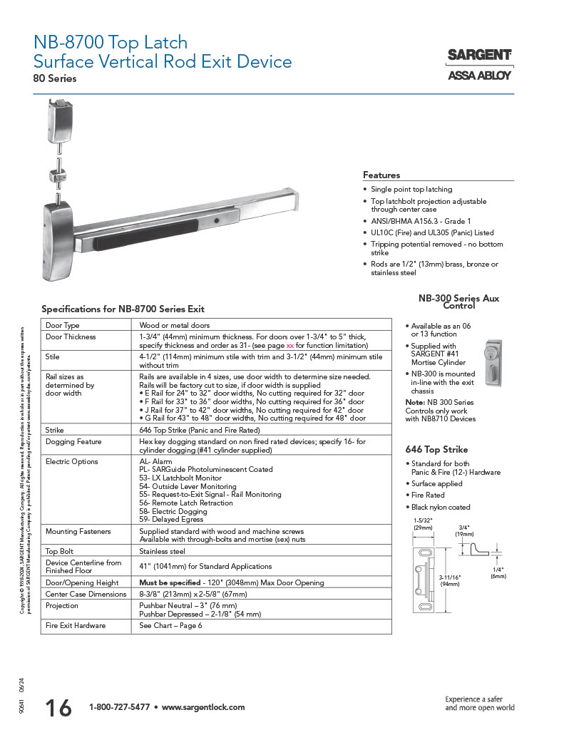 Single point top latching Top latchbolt projection adjustable through center case Devices are ANSI A156.3 - Grade 1 UL Fire and Panic listedTripping potential removed - no bottom strike Rods are 1/2" (13mm) brass, bronze or stainless steelDoor TypesWood or metal 1 3/4" (44mm) minimum thickness