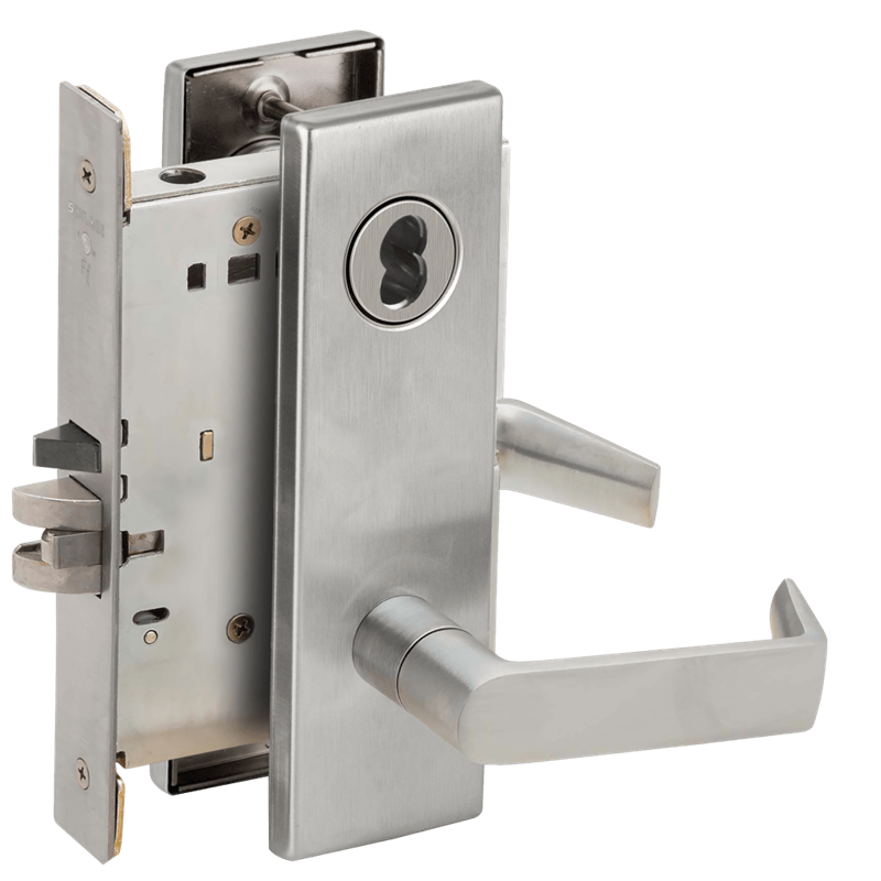 Latchbolt retracted by knob/lever from either side unlessoutside is locked by key. Unlocked from outside by key.Inside knob/lever always free for immediate exit. Auxiliarylatch deadlocks latchbolt when door is closed. Inside leveris always free for immediate egress.