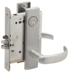 Latchbolt retracted by key outside or by knob/lever inside. Outside knob/lever always inoperative. Auxiliary latch deadlocks latchbolt when door is closed. Inside lever is always free for immediate egress.