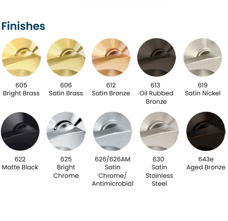 Finishes: 626 - Satin Chrome, 613 - Oil Rubbed Bronze, 622 - Matte Black, 630 - Satin Stainless Steel