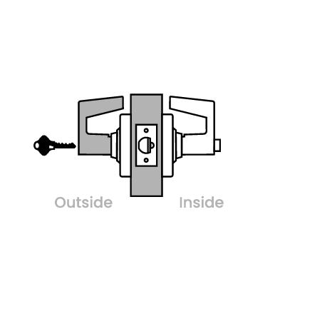 Outside lever is fixed. Entrance by key only. Push-button in inside lever activates visual occupancy indicator, allowing only emergency master key to operate. Turn inside lever or close door to release visual occupancy indicator. Rotation of inside spinner-button provides lock-out feature by keeping indicator thrown.