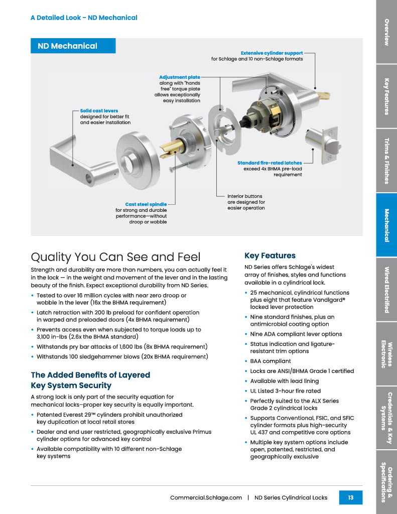 Keying: 6-Pin Solid brass Cylinder, C or Everest C123 keyway with two nickel silver keys per lock. Other keying options available include master keying, grand master keying, construction keying, and interchangeable core. The door range for the ND85 is 1 3/4"-2".