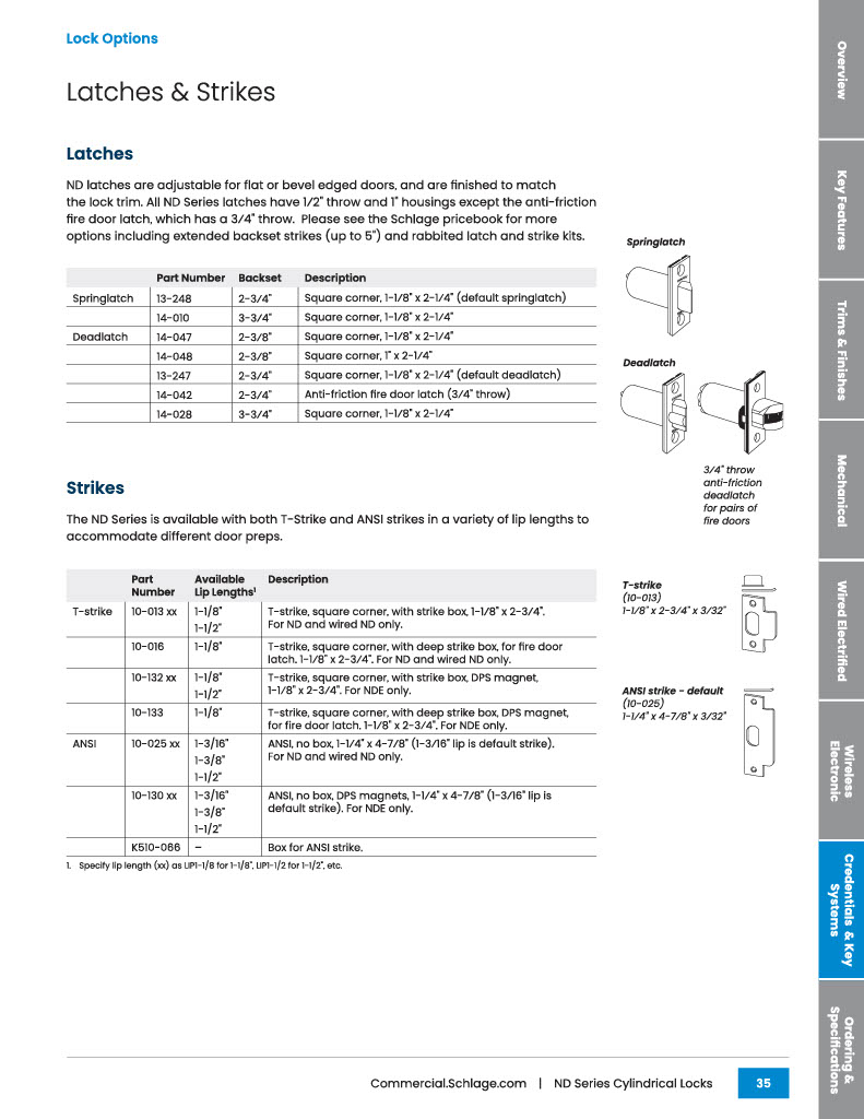 Strikes: ANSI curved lip strike 1 1/4" x 4 7/8" (32 mm x 124 mm), 1 3/16" (30 mm) to center standard. Optional strikes, lip lengths and ANSI strike box available.