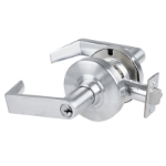 Outside lever is fixed. Entrance by key only. Push-button in inside lever activates visual occupancy indicator, allowing only emergency master key to operate. Turn inside lever or close door to release visual occupancy indicator. Rotation of inside spinner-button provides lock-out feature by keeping indicator thrown.